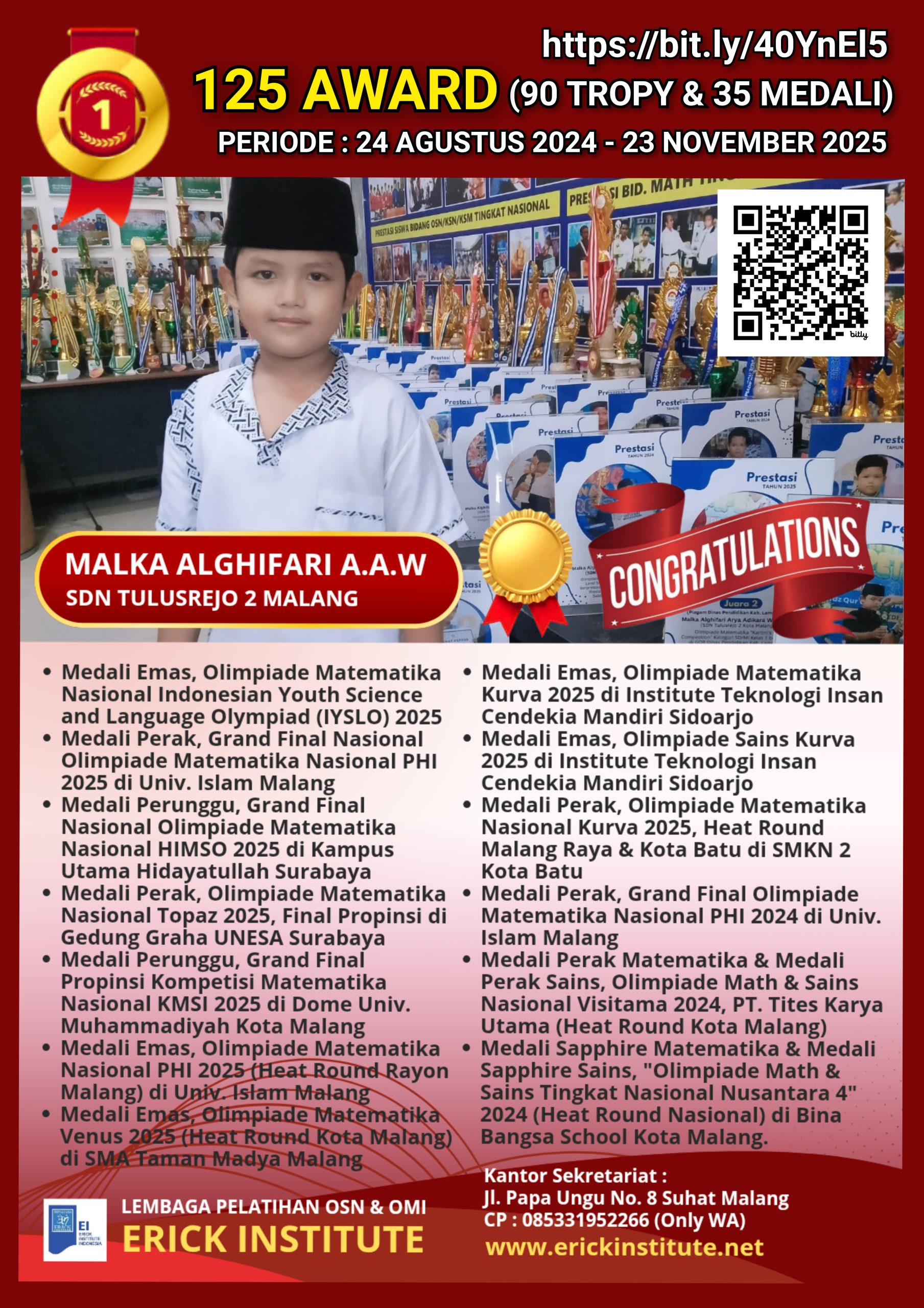 Olimpiade Sains (IPA) Level SD/MI Kelas 1 (Piagam Dinas Pendidikan Kab. Blitar). Festival Anak Berbakat dan Berprestasi Season 4 Se- Karesidenan Kediri X Concity dalam rangka Harlah ke – 11 SMP Mamba’ul Hisan Kab. Blitar – MJ EO bertempat di SMP Mamba’ul Hisan Kabupaten Blitar, Minggu, 2 Februari 2025