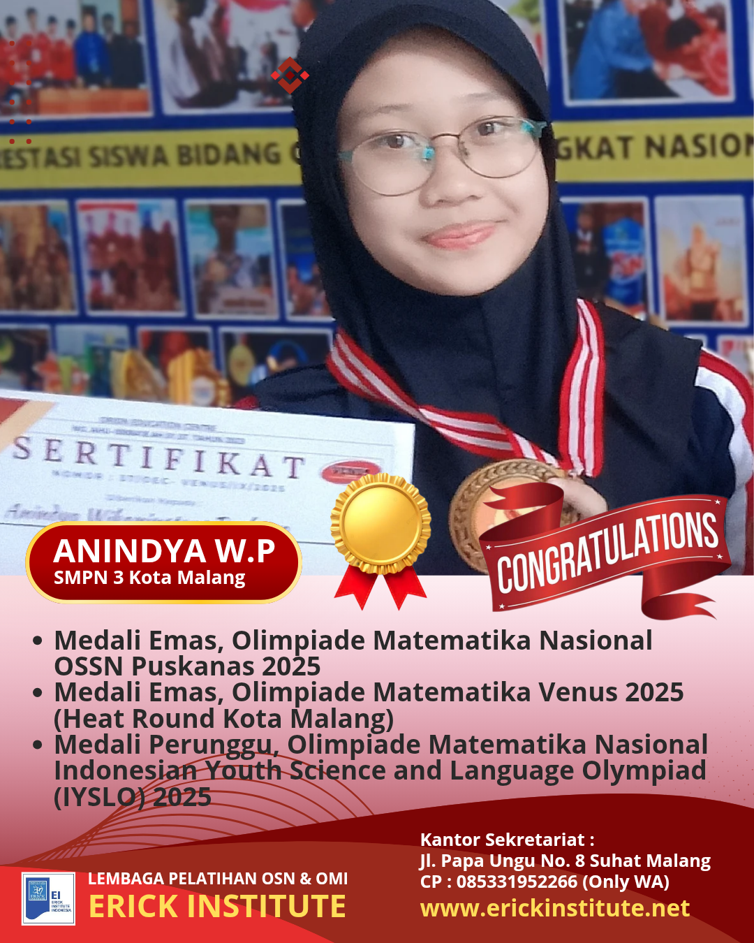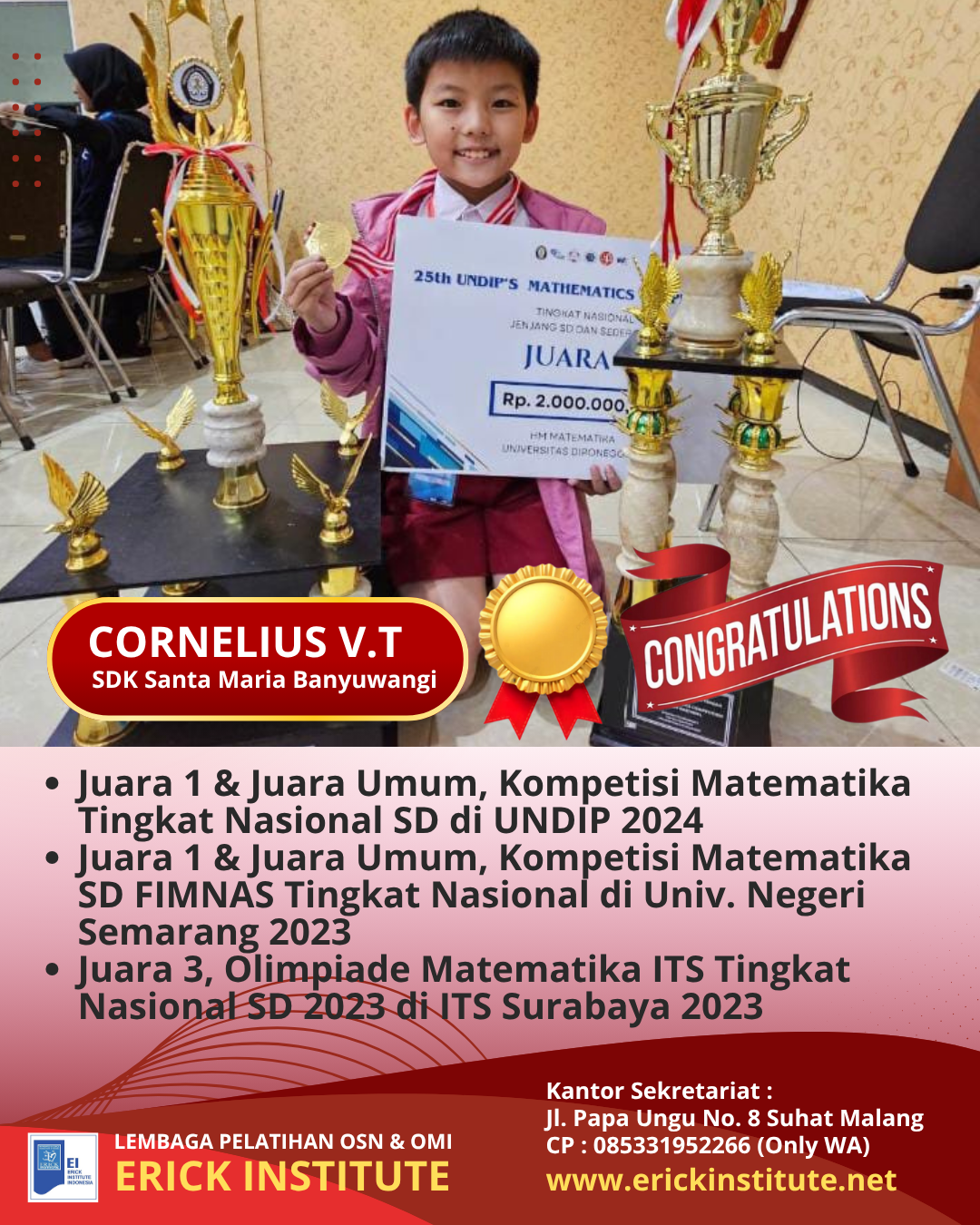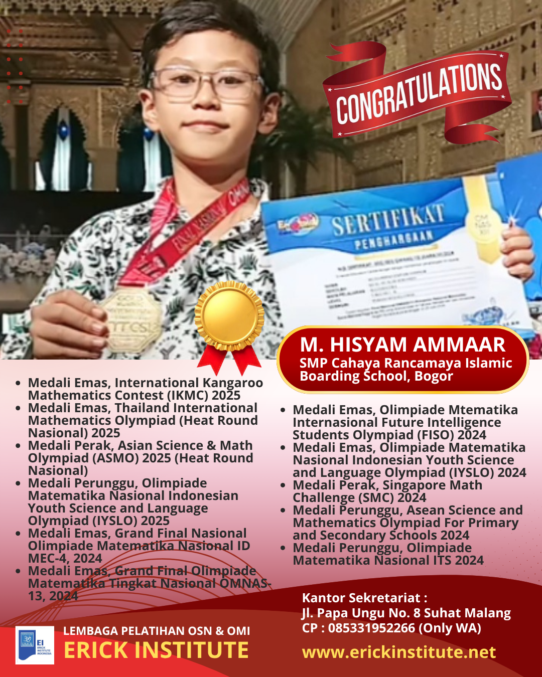 Prestasi Siswa Pelatihan Camp Erick Institute (Khusus Bidang Olimpiade Matematika) Tahun 2018 – 2023