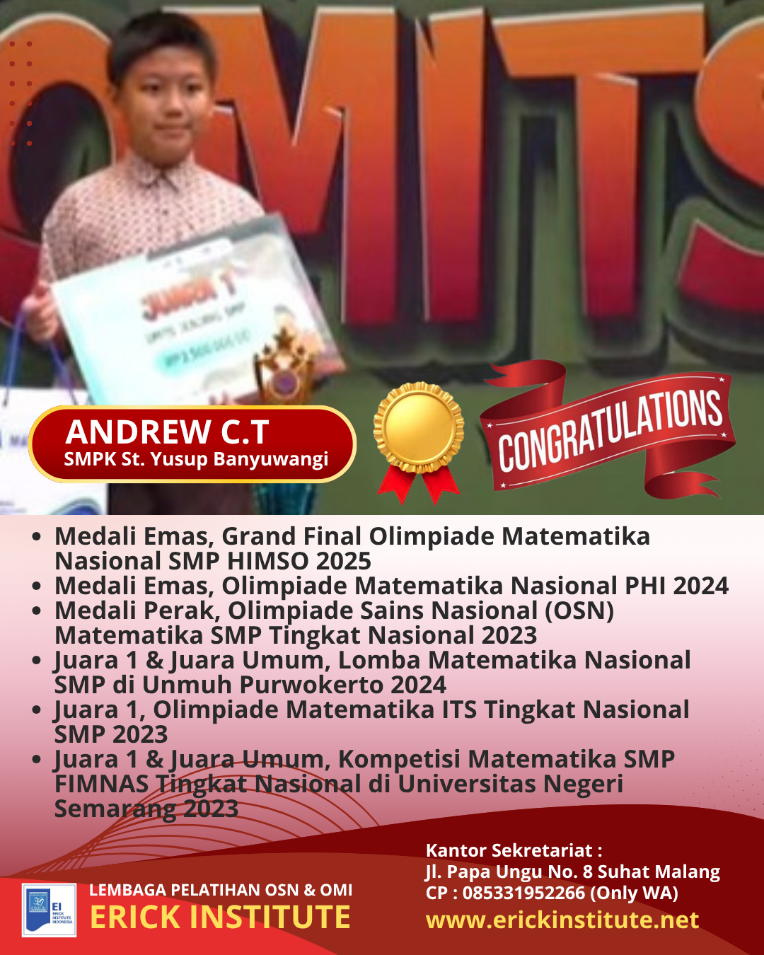 Olimpiade Matematika PHI KE – XXII SMP Tingkat Nasional di Univ. Islam Malang (Andrew Carnegie Tan, SMPK Santo Yusup Banyuwangi), 1 Oktober 2023