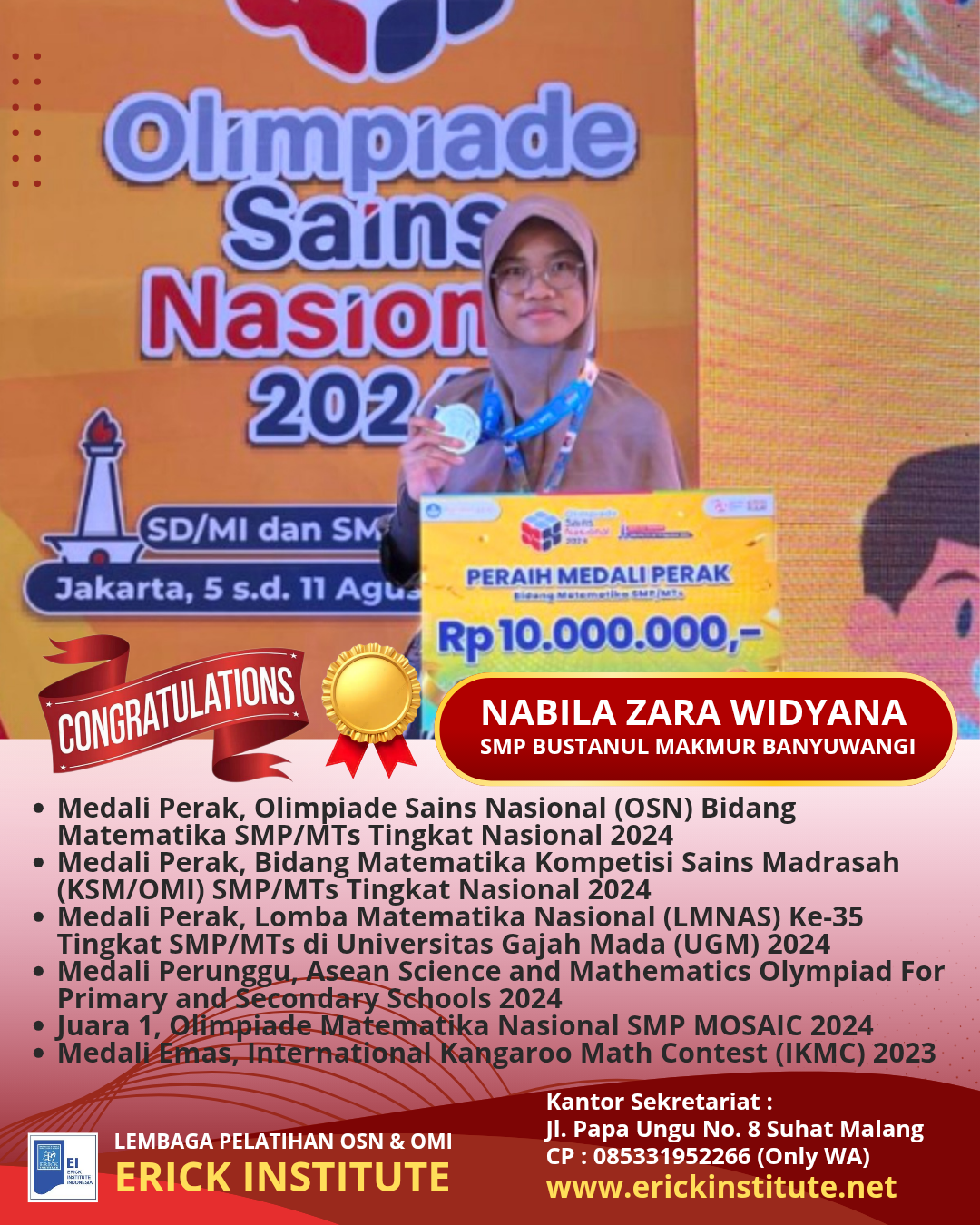 Bidang Matematika Olimpiade Sains Nasional (OSN) SMP/MTs Tingkat Nasional 2024 yang diselenggarakan oleh Puspresnas Kemdikbud RI di Jakarta (Nabila Zara Widyana, SMP Bustanul Makmur, Banyuwangi), 5-11 Agustus 2024