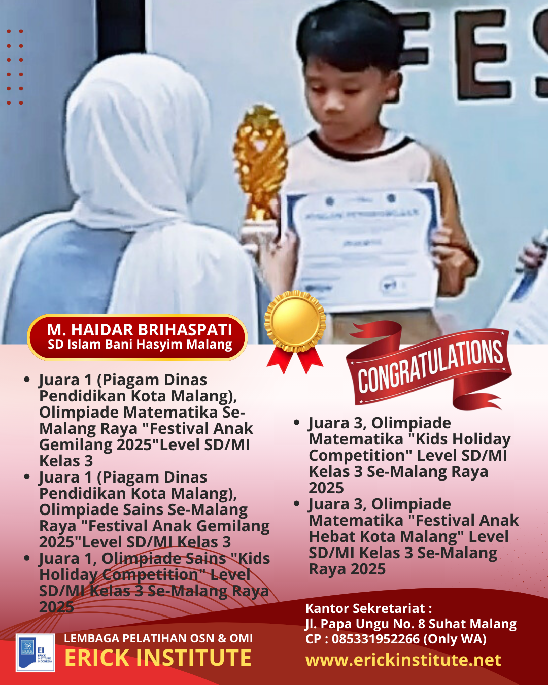 27. Juara 1, Olimpiade Matematika SEISMIC 2025 di SMP Bahrul Maghfiroh Kota Malang .